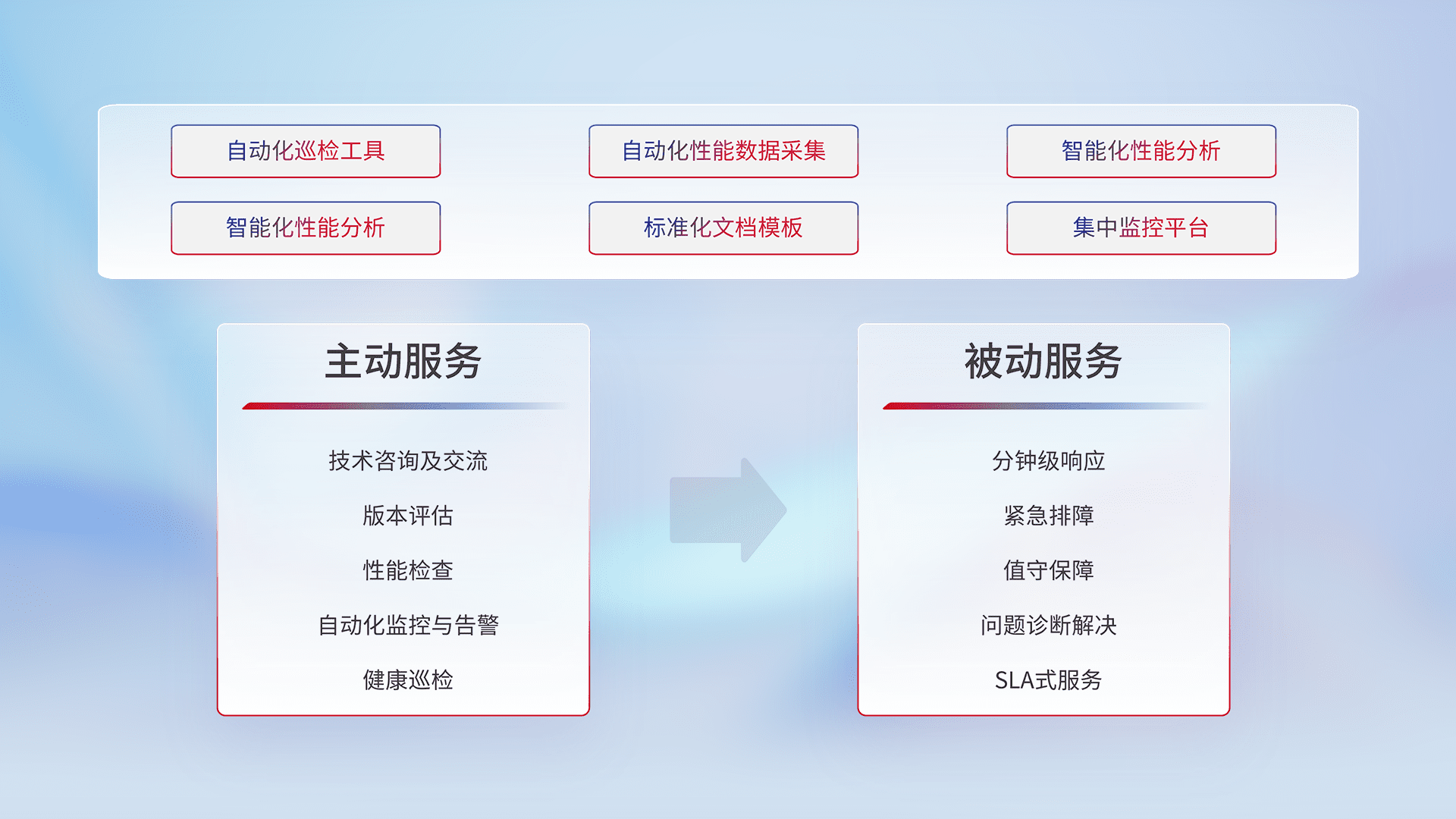 智能化工具和标准化文档,,,,保障服务质量,,,,提供主动服务(包含技术咨询、、版本评估、、性能检查、、、、自动化监控与告警、、健康巡检)和被动服务包含(分钟级响应、、、、紧急排障、、、值守保障、、、问题诊断解决、、、、SLA服务)。。